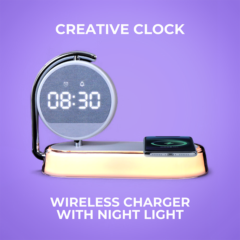 Declutter your nightstand with the all-in-one 3-in-1 Wireless Charging Alarm Clock, a sleek and smart bedside companion designed for the modern lifestyle. This space-saving multifunctional gadget combines a 15W Qi wireless charger, touch-sensitive dimmable night light, and rotatable digital alarm clock-perfect for bedrooms, dorms, or home offices.