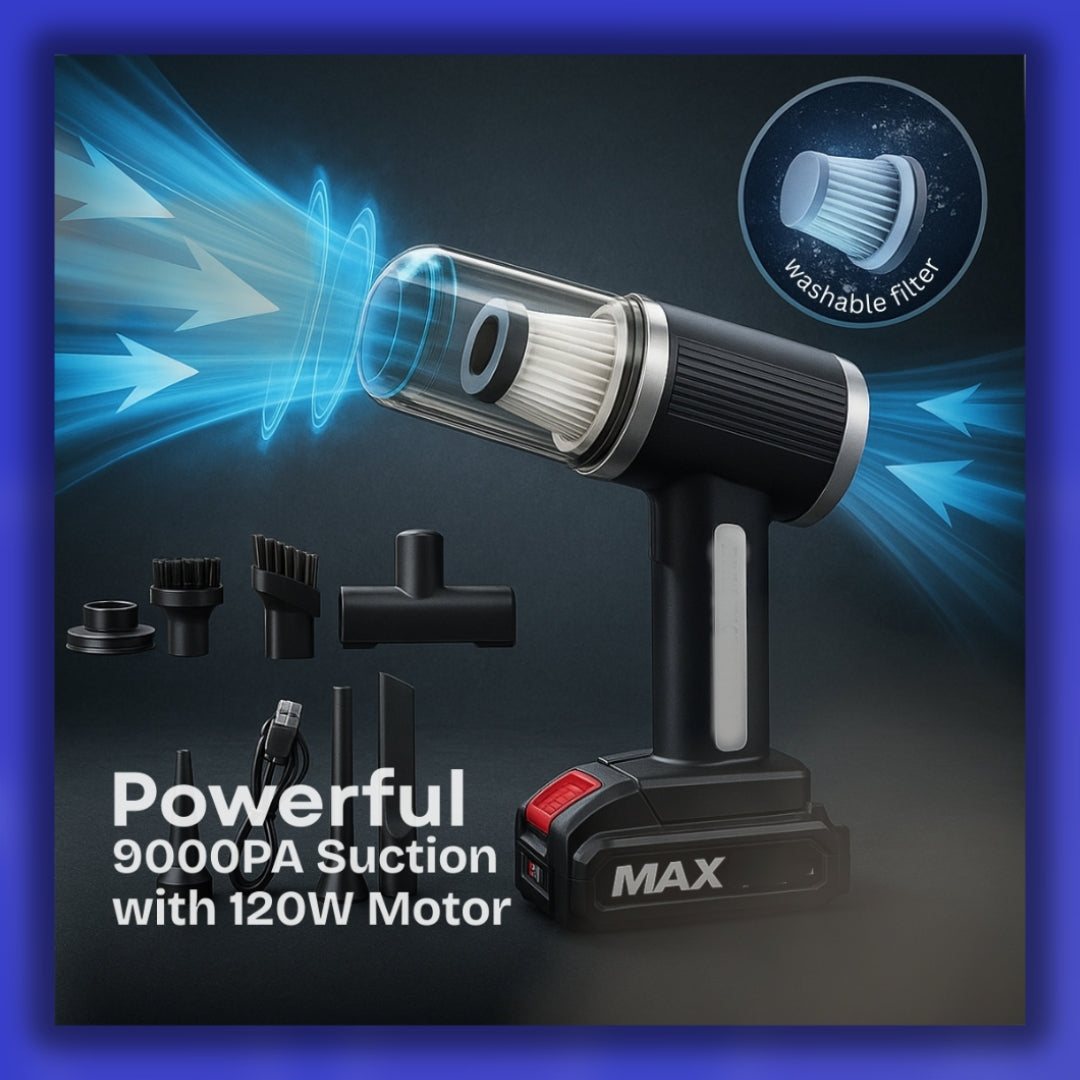 Cordless 4-in-1 Handheld Vacuum Cleaner | 9000PA Suction, 120W Motor, Rechargeable & Portable | Car, Home, Office Use